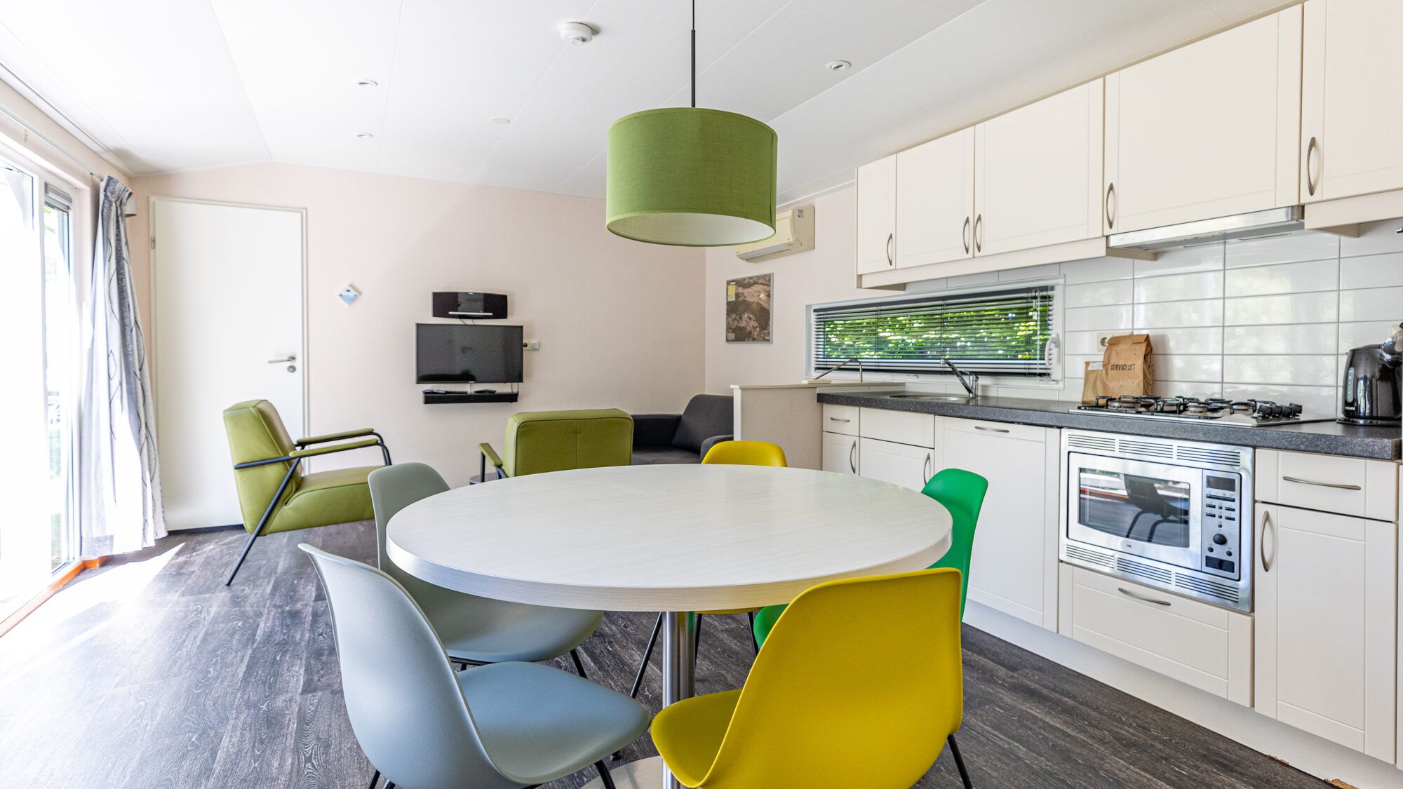 Experience a relaxing vacation in our comfortable 5-person dune bungalow. The living room is equipped with a spacious sofa and a digital TV with radio, ideal for cozy evenings. The open kitchen is fully equipped with modern conveniences such as a dishwasher, combination microwave, Senseo machine, coffee maker and fridge-freezer.