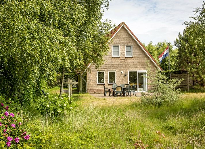 La terrasse spacieuse, avec des chaises longues, est orientée vers le sud et il y a un grand terrain de jeu derrière la maison de vacances.