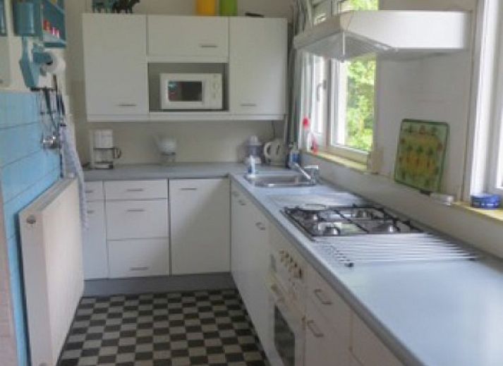 La cuisine ouverte est équipée d'un réfrigérateur-congélateur, d'un four, d'un micro-ondes et d'un grand plan de travail.