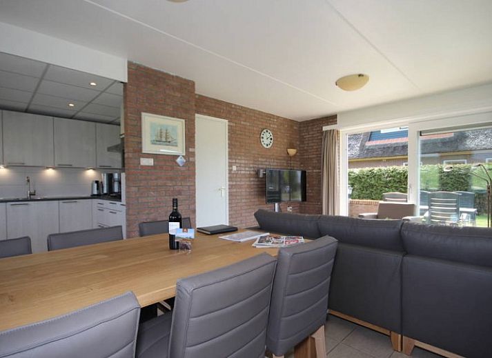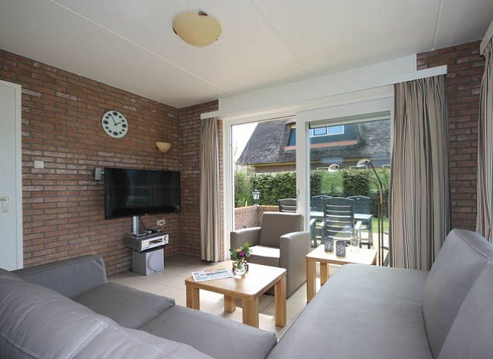 L'entrée de ce bungalow pour 6 personnes se fait par le hall avec les toilettes. Par le couloir, vous entrez dans l'agréable salle de séjour avec cuisine ouverte. Le salon est équipé d'une télévision à écran plat avec câble numérique, d'une radio et d'un lecteur DVD/CD. L'ensemble du salon et de la cuisine est équipé d'un chauffage par le sol.