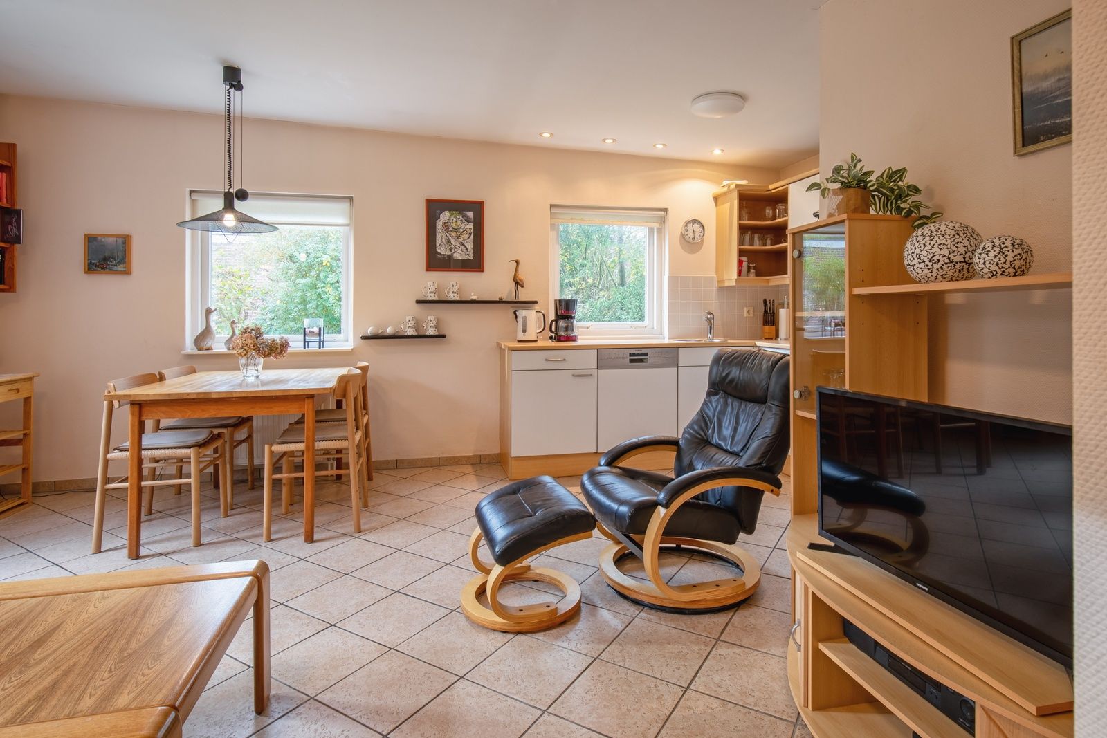 Il y a une télévision avec connexion au câble. La cuisine ouverte est équipée d'une cafetière à filtre, d'une bouilloire, d'un lave-vaisselle et d'un réfrigérateur. Deux chambres à coucher, chacune avec deux lits simples équipés d'oreillers et de couettes. Salle de bains spacieuse avec douche, lavabo et toilettes. Dans la salle de bains, vous trouverez également une machine à laver. Grand jardin avec terrasse et parking privé. Meubles de jardin disponibles. Il est interdit de fumer dans le bungalow.