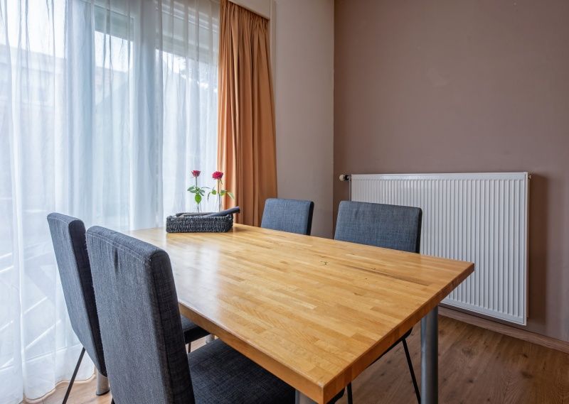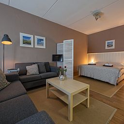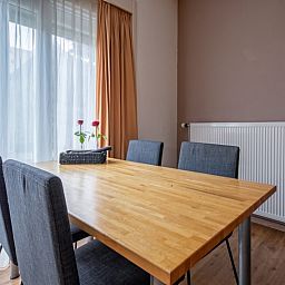 Cet appartement est situé au rez-de-chaussée. Le salon dispose d'un coin salon avec un canapé 2 personnes et un canapé 3 personnes, d'une télévision LED et d'un coin repas avec une table et 4 chaises. Il y a un lit extra large à sommier tapissier pour 2 personnes dans la chambre (180x200). La kitchenette est équipée d'une plaque vitrocéramique à deux feux et d'un réfrigérateur. La salle de bains est équipée d'une douche et de toilettes. L'appartement dispose d'une terrasse spacieuse avec un petit jardin orienté au sud. Des meubles de jardin sont fournis.