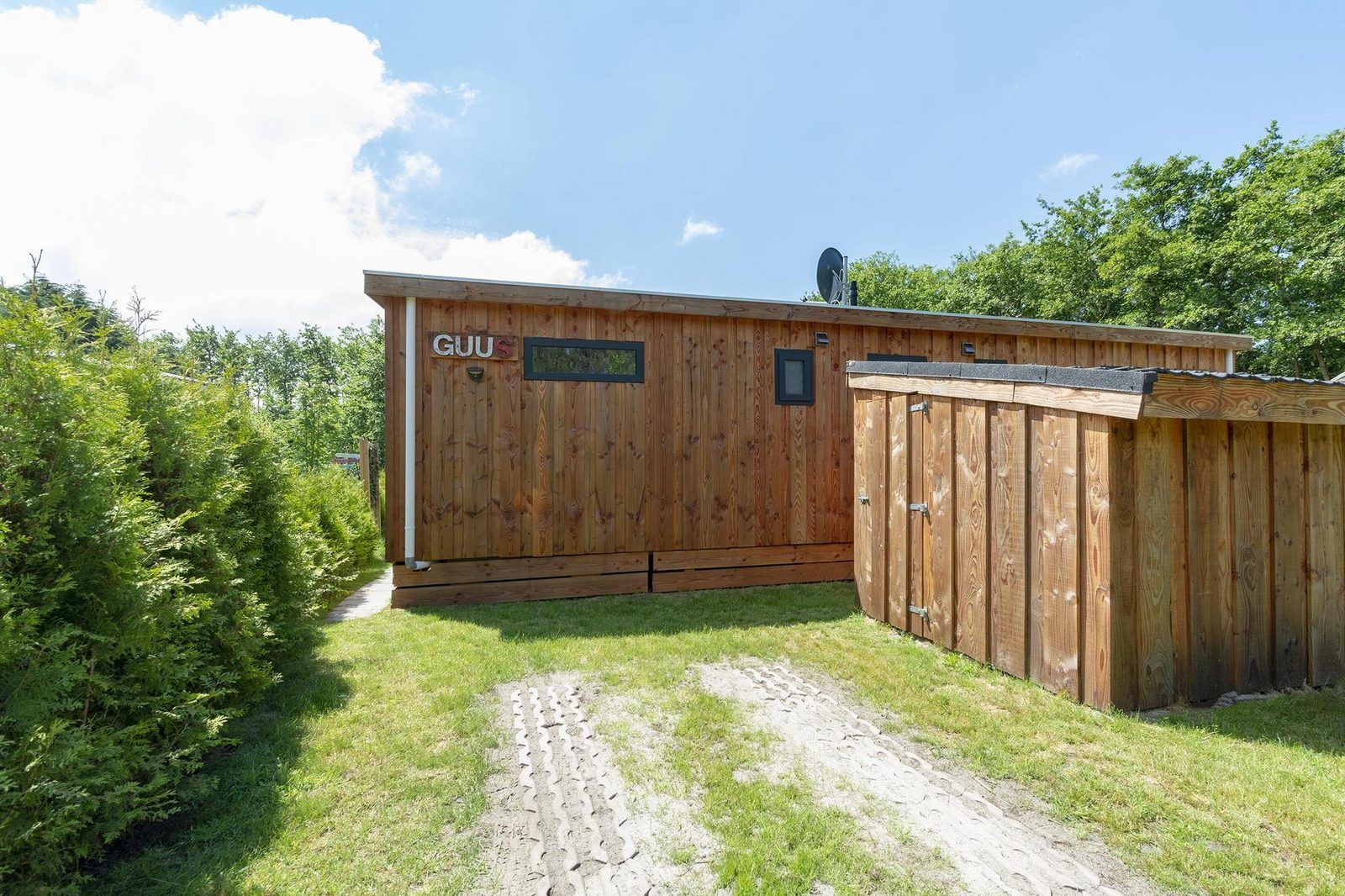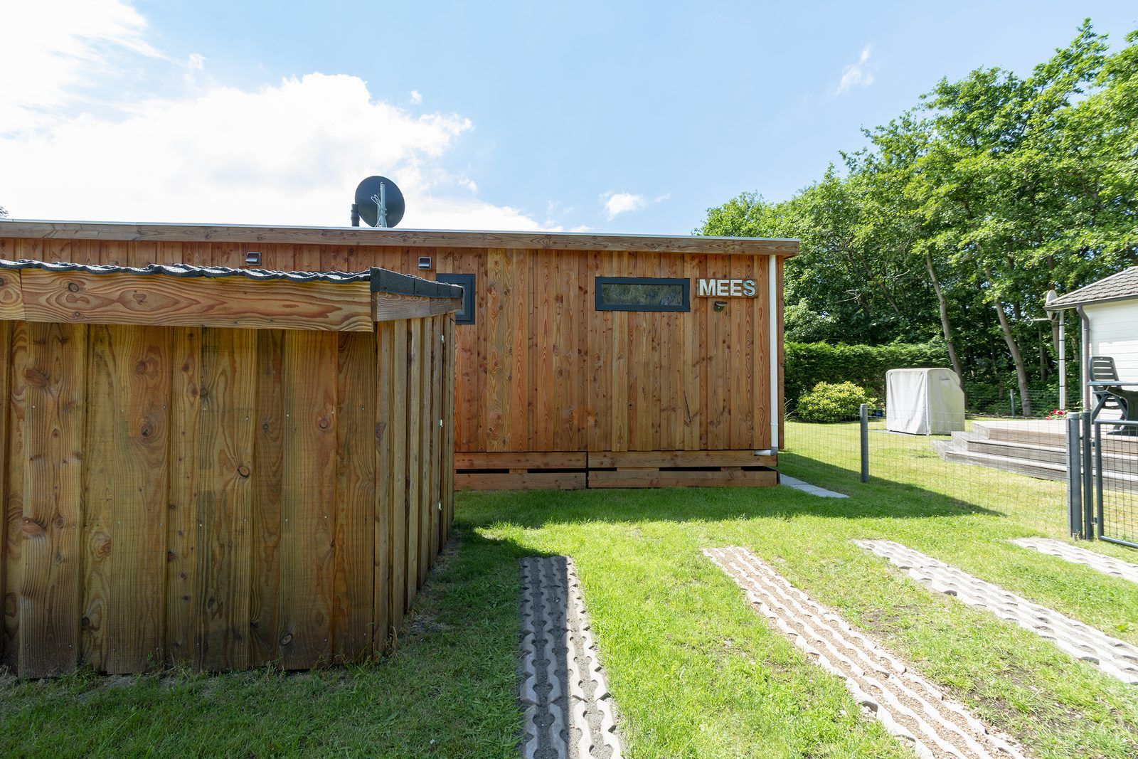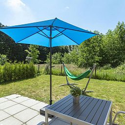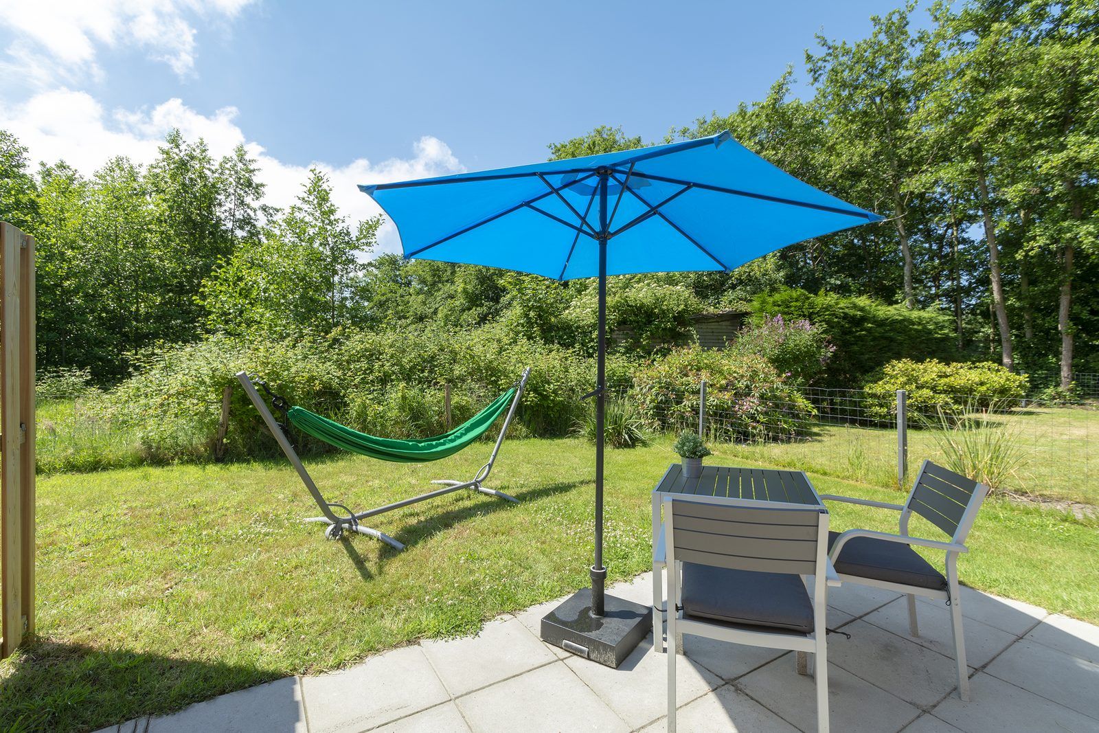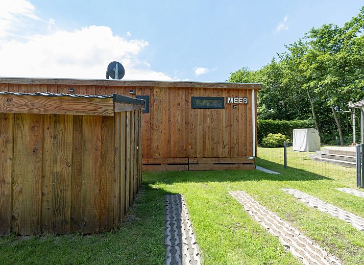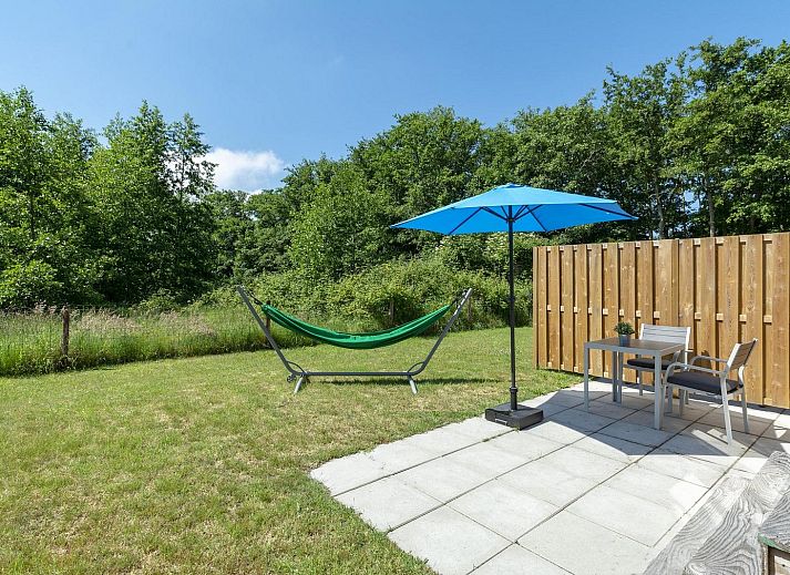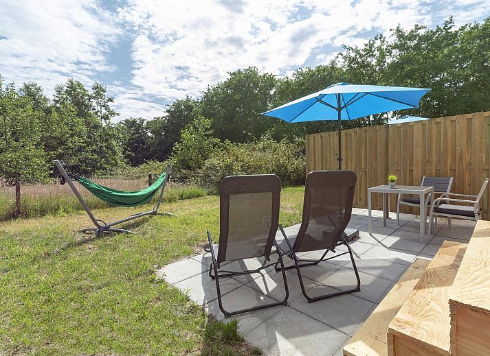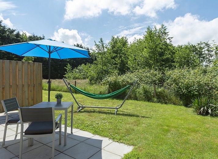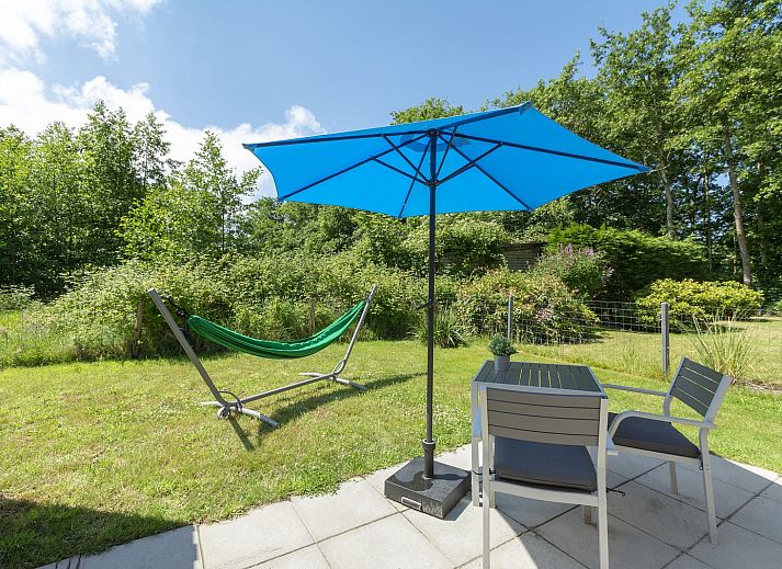 À l'extérieur, sur la terrasse, vous pourrez profiter pleinement de votre séjour, et un hamac confortable est à votre disposition ! Le jardin est séparé du chalet Mees adjacent et offre une vue sur la forêt voisine.