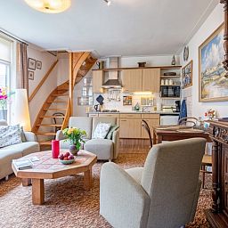 Entrée, salle de séjour avec coin repas, coin salon avec télévision à écran plat et radio avec lecteur DVD/CD. La cuisine ouverte est équipée d'une cuisinière à quatre feux, d'un réfrigérateur avec compartiment congélateur, d'un four à micro-ondes combiné, d'une cafetière Senseo et d'une bouilloire. La salle de bains est équipée d'une douche, d'un lavabo et de toilettes. La buanderie est équipée d'un lave-linge et d'un sèche-linge. À l'étage, vous trouverez une chambre avec deux lits simples et une télévision, ainsi qu'une pièce annexe avec un lit simple. L'appartement dispose d'un petit jardin avec un coin salon.